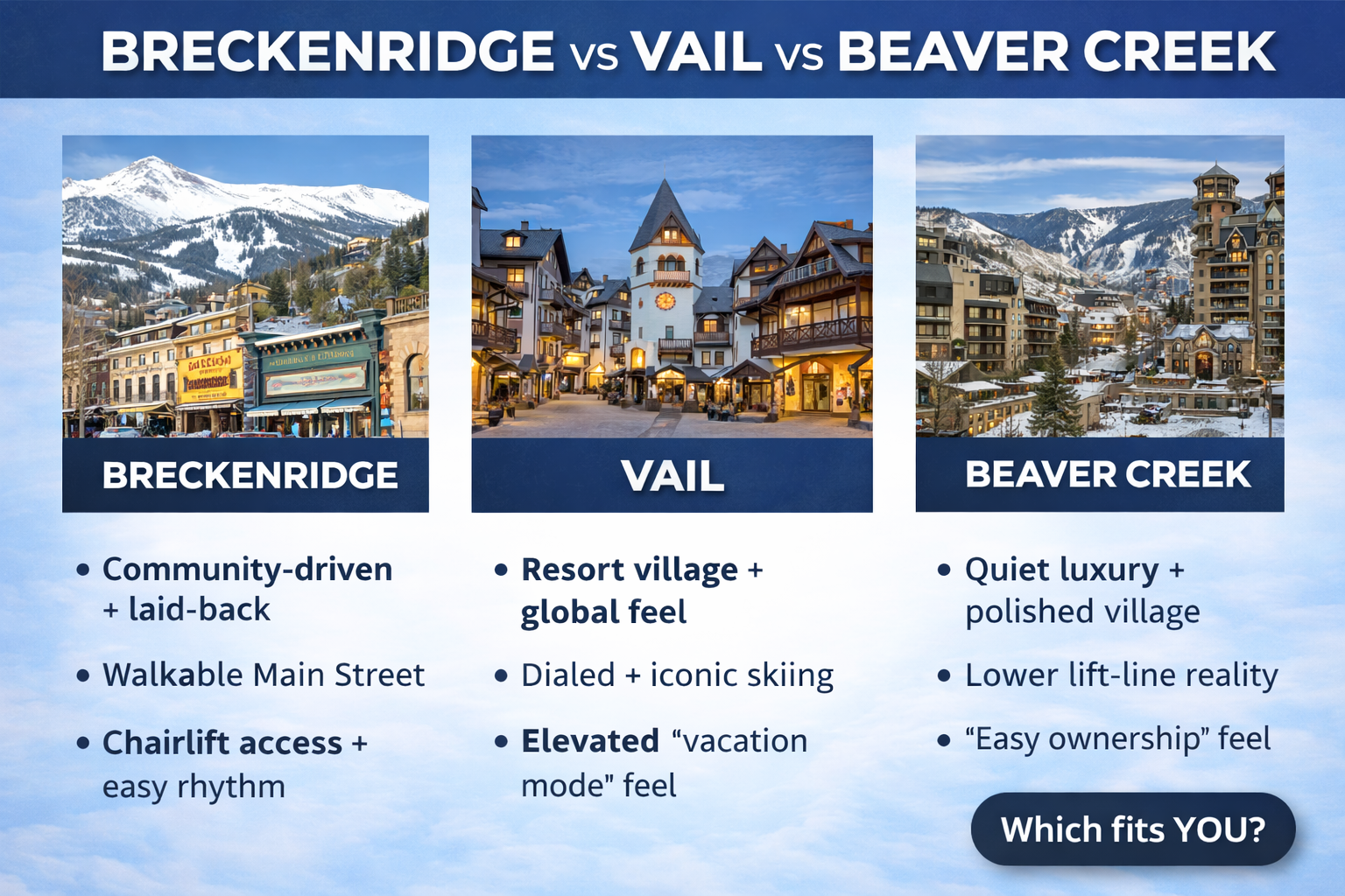 If you’re looking at a mountain home in Colorado, it’s easy to assume Breckenridge, Vail, and Beaver Creek are basically the same thing… until you spend real time in each one. They’re all “Colorado luxury,” but the vibe can be wildly different—like one town feels instantly like home, and the other makes you feel like you should’ve worn a nicer jacket.